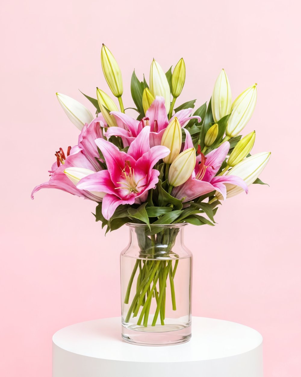 Celebrate with our Lily Bouqk + Vase Gift, a stunning bouquet in a glass vase with pink, white, or mixed lilies. Perfect for gifting, blending vibrant beauty with elegant floral charm. ๐ธ๐ฟ This beautiful bouqk is presented in our luxury 'smell the flowers' gift box.