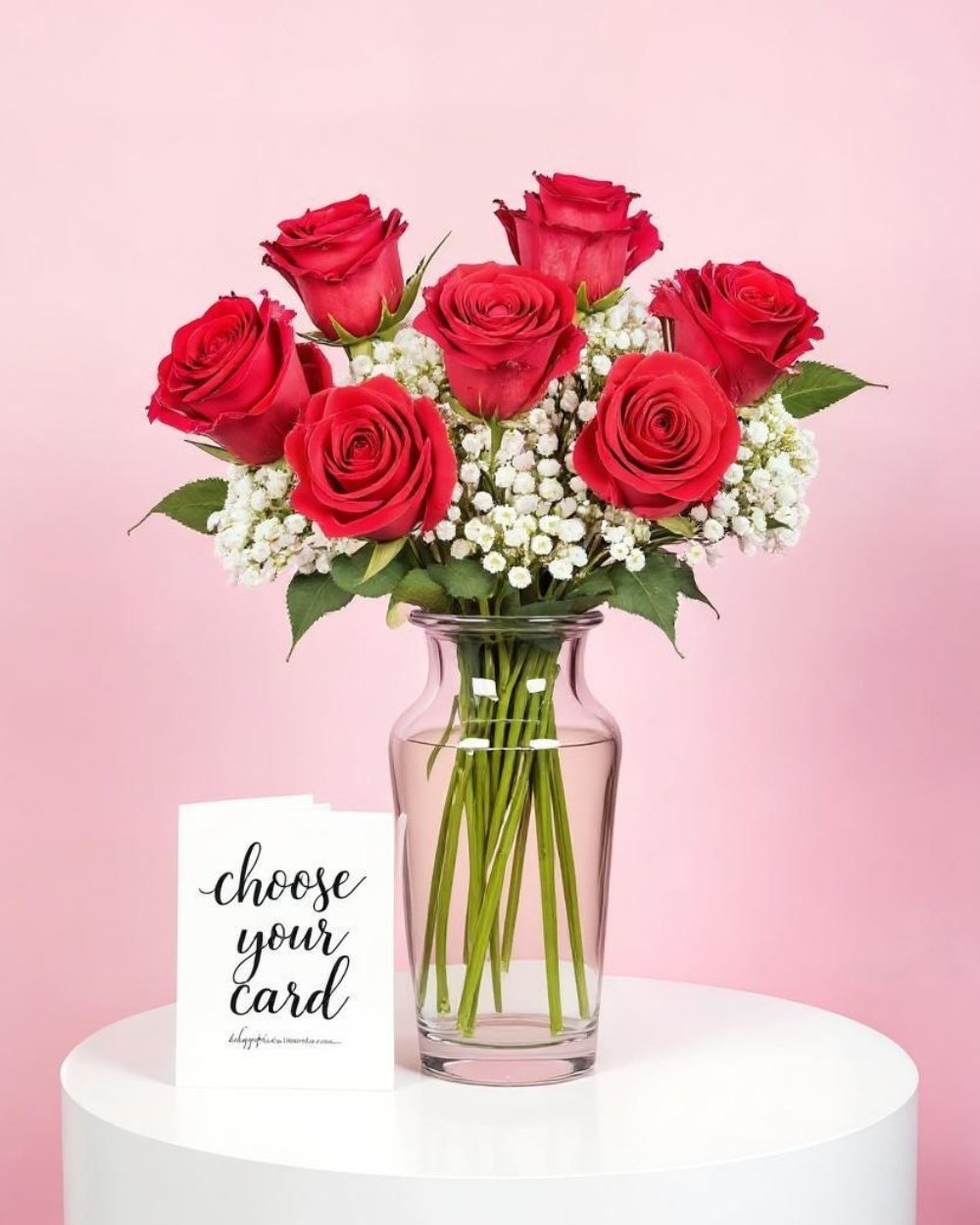 Express affection with our Red Rose Love Bouqk, a striking arrangement of red roses and delicate greenery in a glass vase, paired with a customisable card. Perfect gift for romantic or heartfelt moments. โค๏ธ๐ฟ This beautiful bouqk is presented in our luxury 'smell the flowers' gift box.